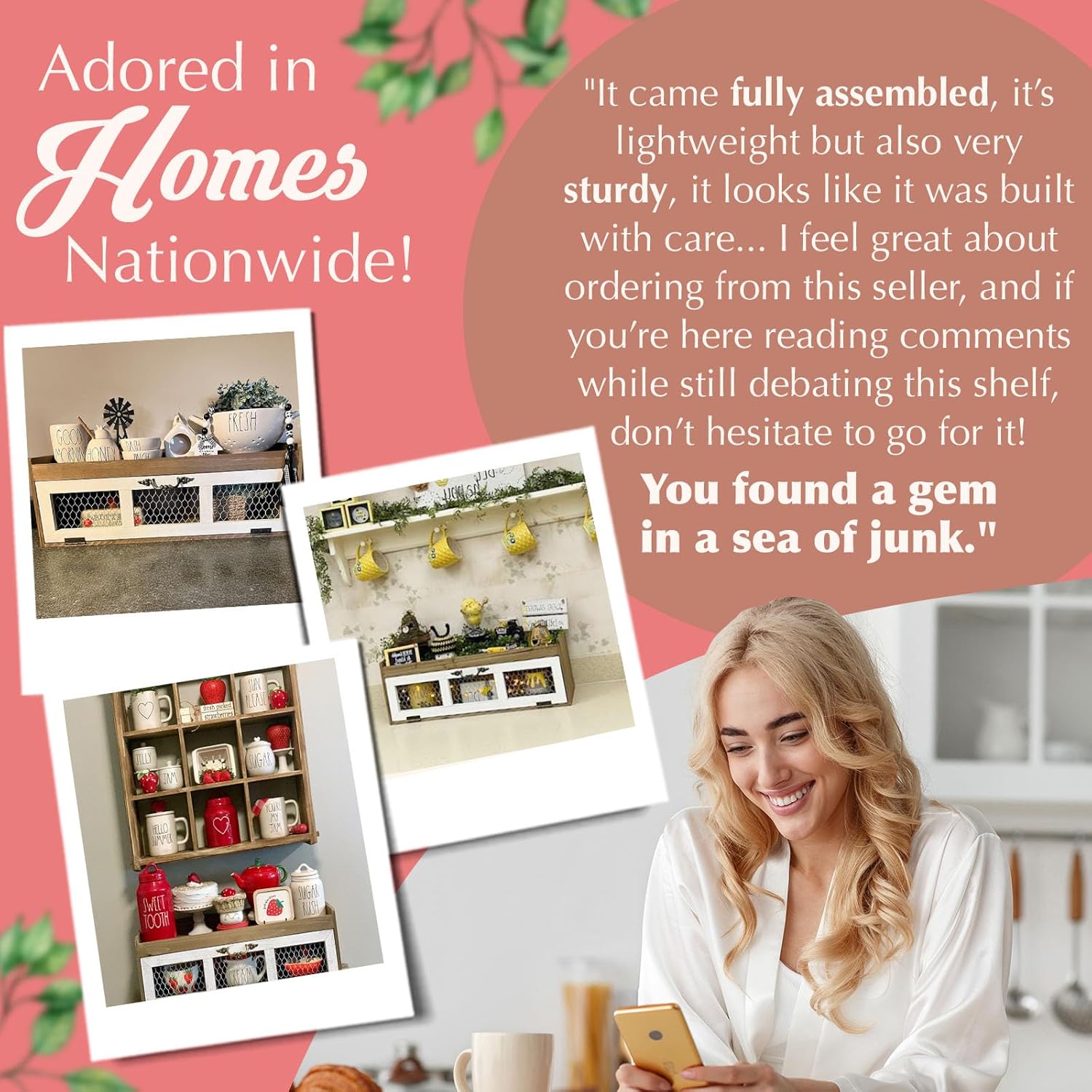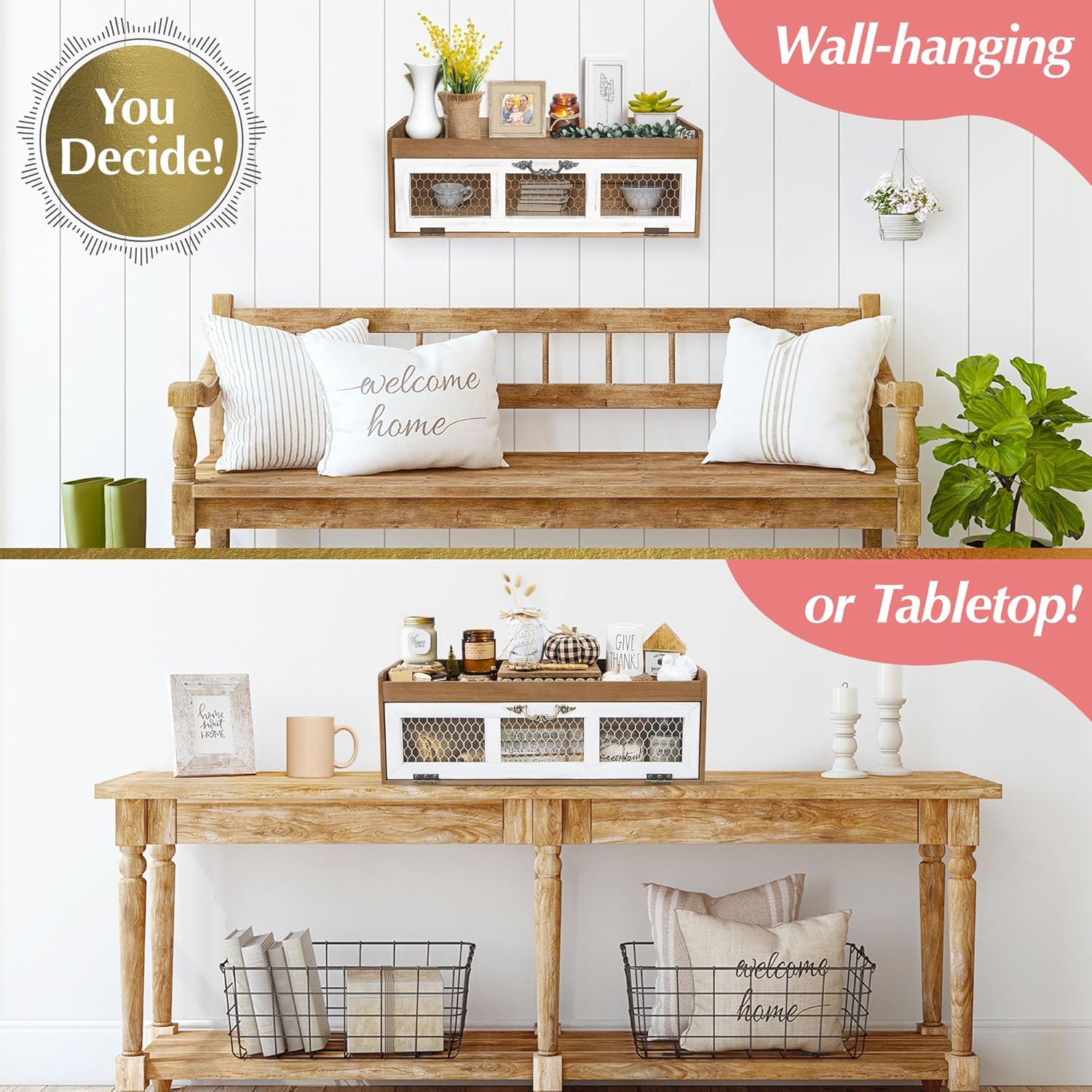 - Arrives Fully Assembled - Get right to decorating on this gorgeous, over 24" wide neutral wood & white chicken wire shelf! Use as bathroom organizer countertop shelf or as your kitchen counter decor space saver and decorative centerpiece! On the counter or wall mounted, these meticulously hand finished pieces provide maximum display space with no inner partitions and includes an upper rimmed shelf for safe display of ceramics!