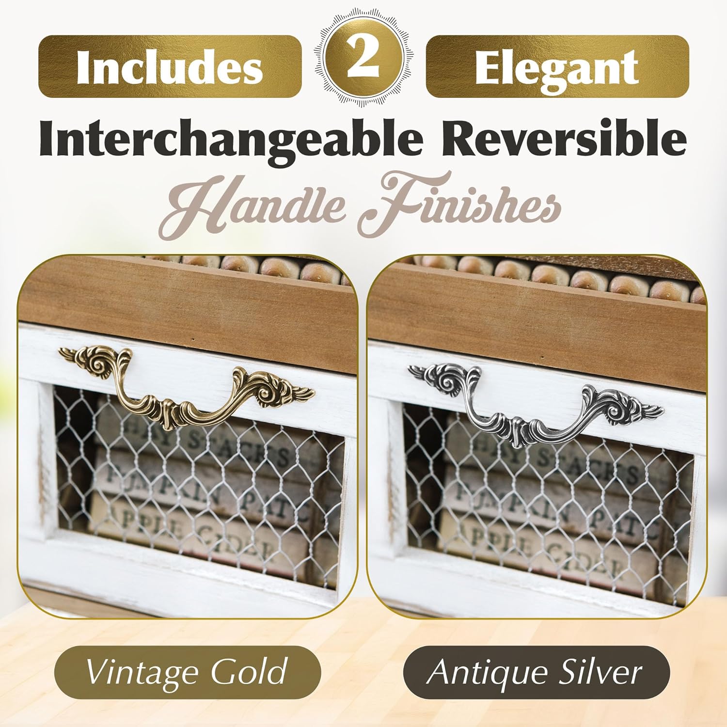 - Two Interchangeable Handles - Are you going for a more seasonal display with your holiday decor? Or are you looking for a more classic, colonial or French style look? Well, look no further! Not only are these table top Storage Organizers super versatile and stunning as is, but we've included an extra handle in every box to make these cabinets even more compatible with your own unique style. Vintage Gold or Antiqued Gunmetal to match any season or decor style - you decide!