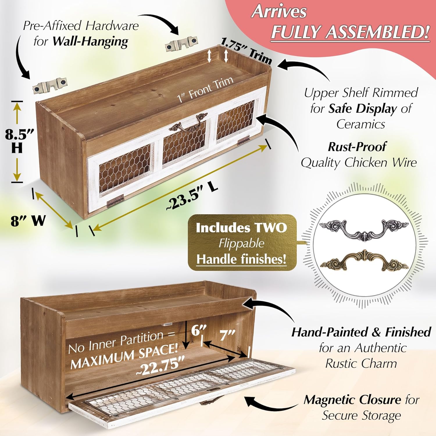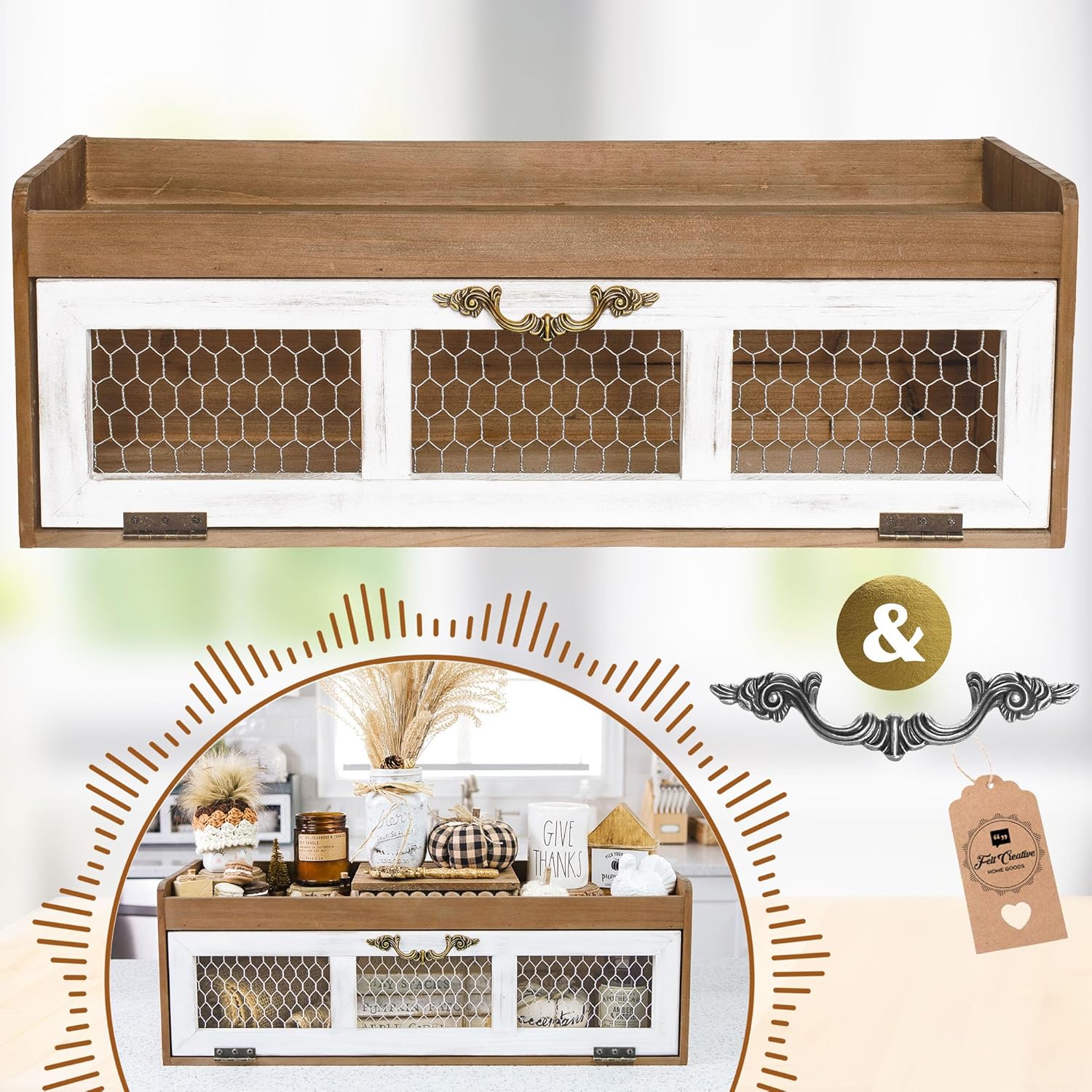 - Rustic-Chic Kitchen Decor - The perfect pantry cabinet you can display as your kitchen counter centerpiece. With an apothecary, coastal decor, almost vintage decor style, this farmhouse cabinet will set the standard for your coffee bar table for all to see. Beautiful on the kitchen countertop, next to the stove, or as a corner countertop storage cabinet, let your chicken kitchen decor box stand out as your very own stylish bread box or coffee hutch.